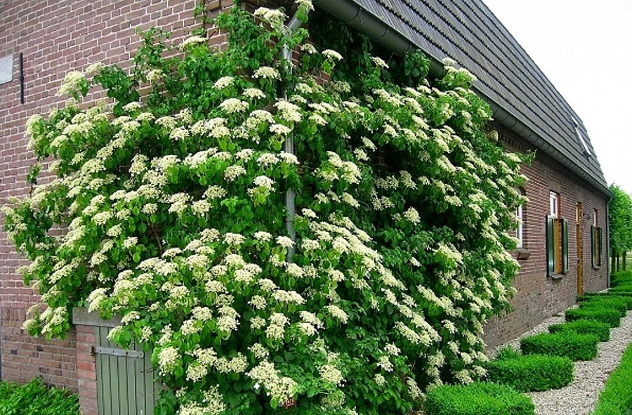 Саженцы гортензии черешковой за пару-тройку лет превратятся в роскошную лиану. Ароматные цветы распускаются в начале лета, первое цветение начинается спустя четыре года после посадки. Интенсивность окраски зависит от типа почвы – самые яркие цветы появляются на растениях, высаженных в кислый субстрат. Правила ухода за лианой-крупномером просты: