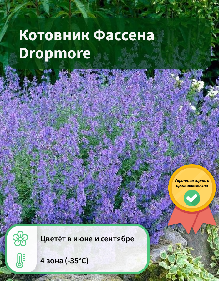 Саженцы Котовника Фассена Dropmore (Nepeta faassenii) отличается своей неприхотливостью и выносливостью. Вырастает в компактный кустарник высотой 30 сантиметров и 60 сантиметров в диаметре. В более прохладном климате будет цвести на протяжении всего лета. Предпочитает солнечные или полутеневые пространства. Почва должна быть сухой. Дропмор цветет насыщенно-голубыми цветками, которые собраны в соцветия-метелки. Отмечается легкий аромат, которые истончает все растение. Особенно обильно цветет в июне месяце. Шикарно смотрится в оформлении бордюров или в отдельных контейнерах.