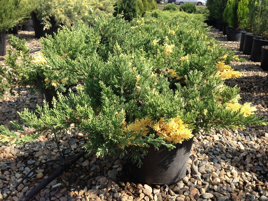 Саженцы Можжевельника китайского Экспанса Вариегата (Expansa Veriegatа) – интересный вариант для групповых и солитерных посадок, украшения японских садиков и альпийских горок, так как кремовые вставки на голубовато-зеленой хвое смотрятся весьма оригинально. Морозостойкий и пестрый сорт предпочитает хорошо освещенные места, так как в тени крона может плохо формироваться; к почве и влаге саженцы и крупномеры не требовательны. Раскидистая крона не достигает в высоту более полуметра, а побеги - стелющиеся, поэтому растения можно применять как почвопокровные культуры.