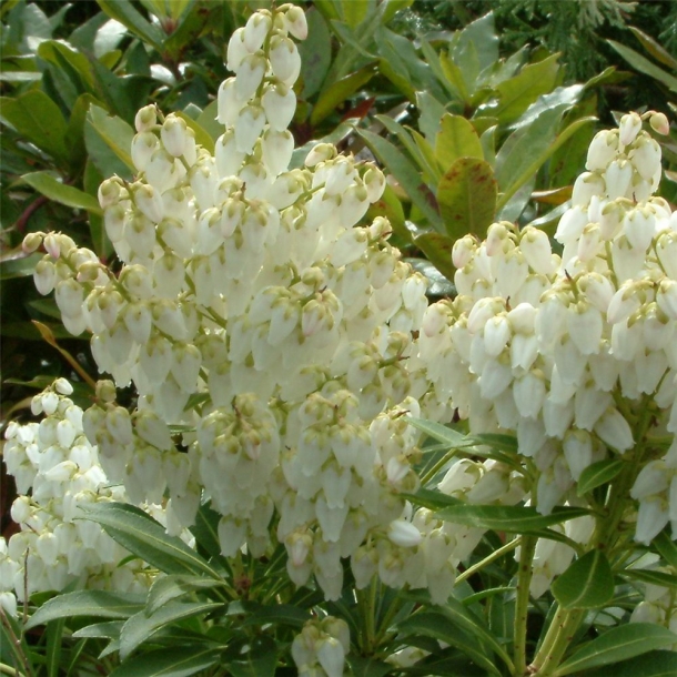 Саженцы Пиериса японского Дебютант (Debutante) – кустарник, который ценят не только за красоту, но и за медленный рост. Максимальный размер полтора метра, причём размер одинаковый, что в высоту, что в длину. У молодых растений кора гладкая, у более старых – отслаивающаяся полосками. Глянцевые листики красиво отражают цвет. В сезон кустарник покрывается белоснежными цветами, и украшают сад до конца апреля. Затем на ветках появляются тёмные ягоды. Этот вид пиериса имеет плоские корни, которые располагаются близко к поверхности. Чтобы кустарник хорошо перенёс зиму, следуют мульчировать землю листвой.