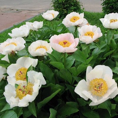 Луковицы пиона травянистого Реквием ― межвидовой гибрид, который был выведен американскими селекционерами в 1941 году. Куст, достигающий в высоту 85 сантиметров, сохраняет декоративность на протяжении всего сезона. На прямых стеблях распускаются простые белоснежные цветы с легким светло-розовым оттенком. Лепестки имеют прекрасную текстуру, как будто изготовлены из воска. Пестики желто-зеленого цвета имеют опрятные розовые рыльца. С цветами эффектно контрастируют очень крупные глянцевые листья насыщенного зеленого цвета. Сорт со средне-ранним и очень обильным цветением порадует прекрасными цветами в мае.